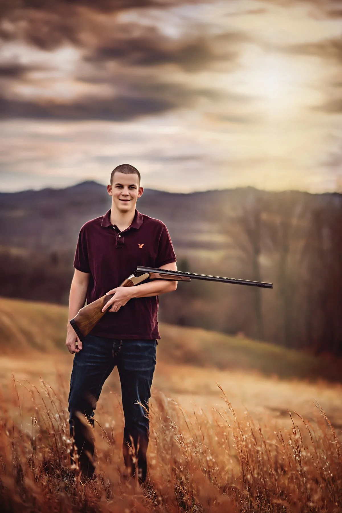 We planned this unique session to highlight Logan’s enthusiasm for skeet shooting and his connection to the land he loves. The barn, surrounded by sprawling fields and rustic charm, provided a perfect setting to showcase both his love for the sport and the comforts of his family heritage.